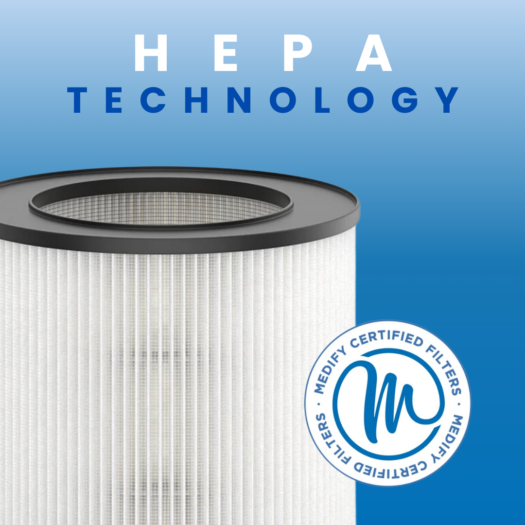 The True HEPA H13 filters capture 99.97% of fine particles down to 0.1 microns, ensuring more efficient filtration over time. These durable, medical-grade filters have a longer lifespan, maintaining optimal performance and reducing the need for frequent replacements, ensuring cleaner air for an extended period.