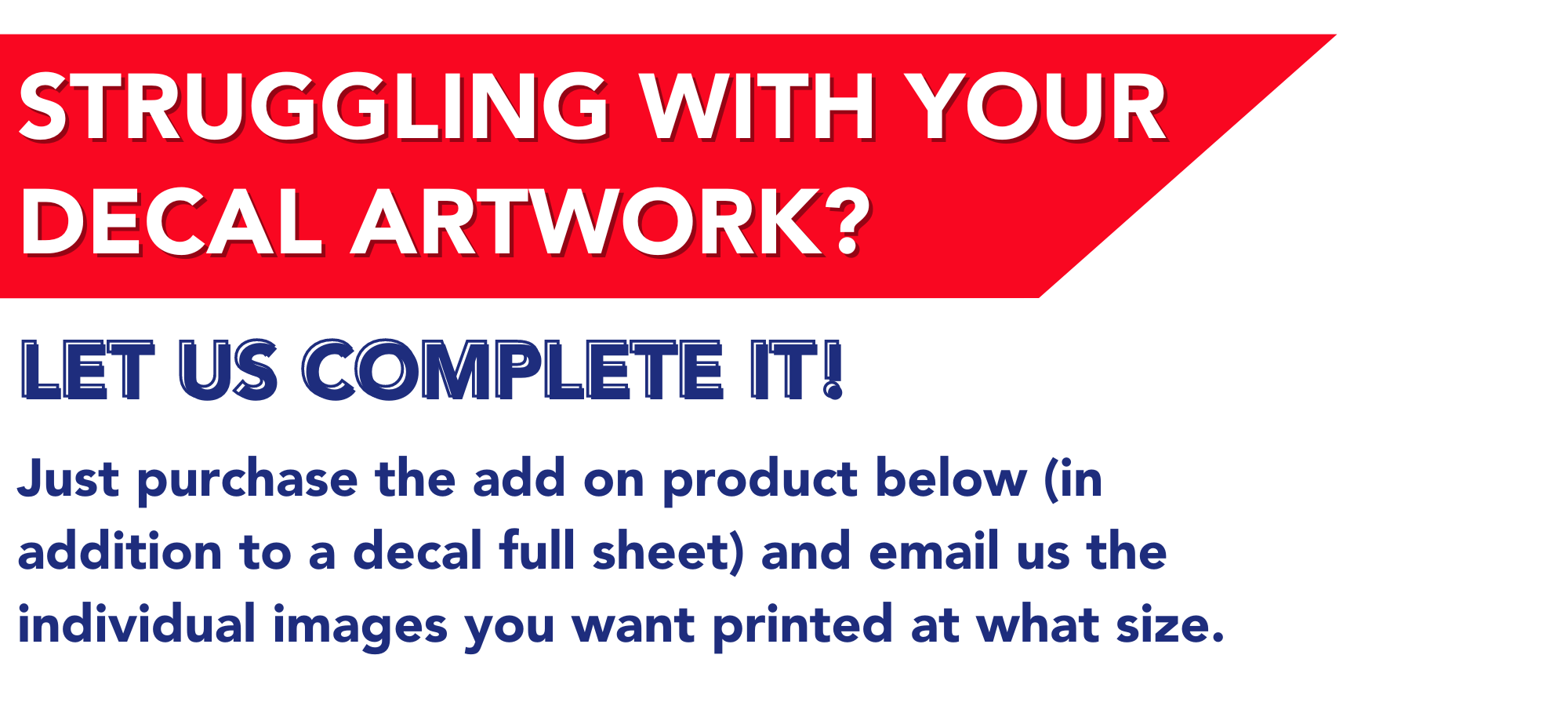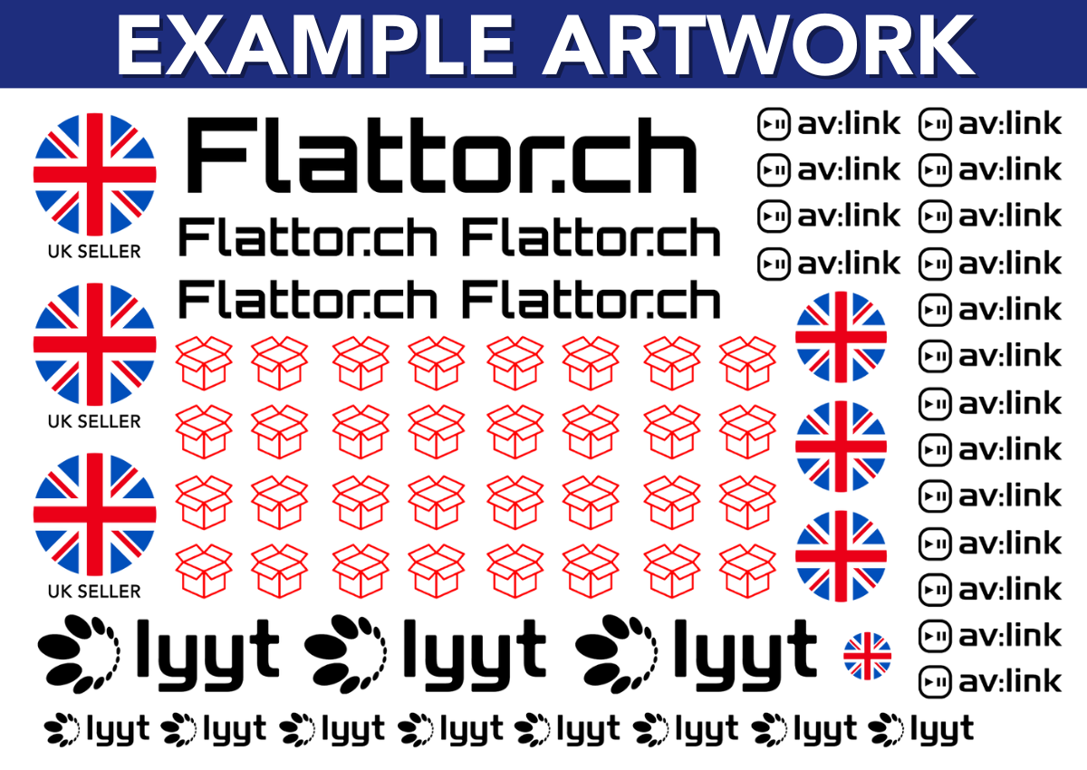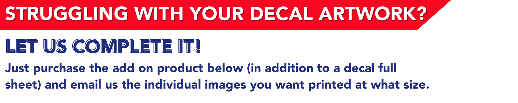 If you want multiple decals, please fill the artwork sheet with however many decals you want (see example above). Please allow 5mm spacing between each decal and 5mm from the edges of the sheet. All decal artwork documents must have a transparent background