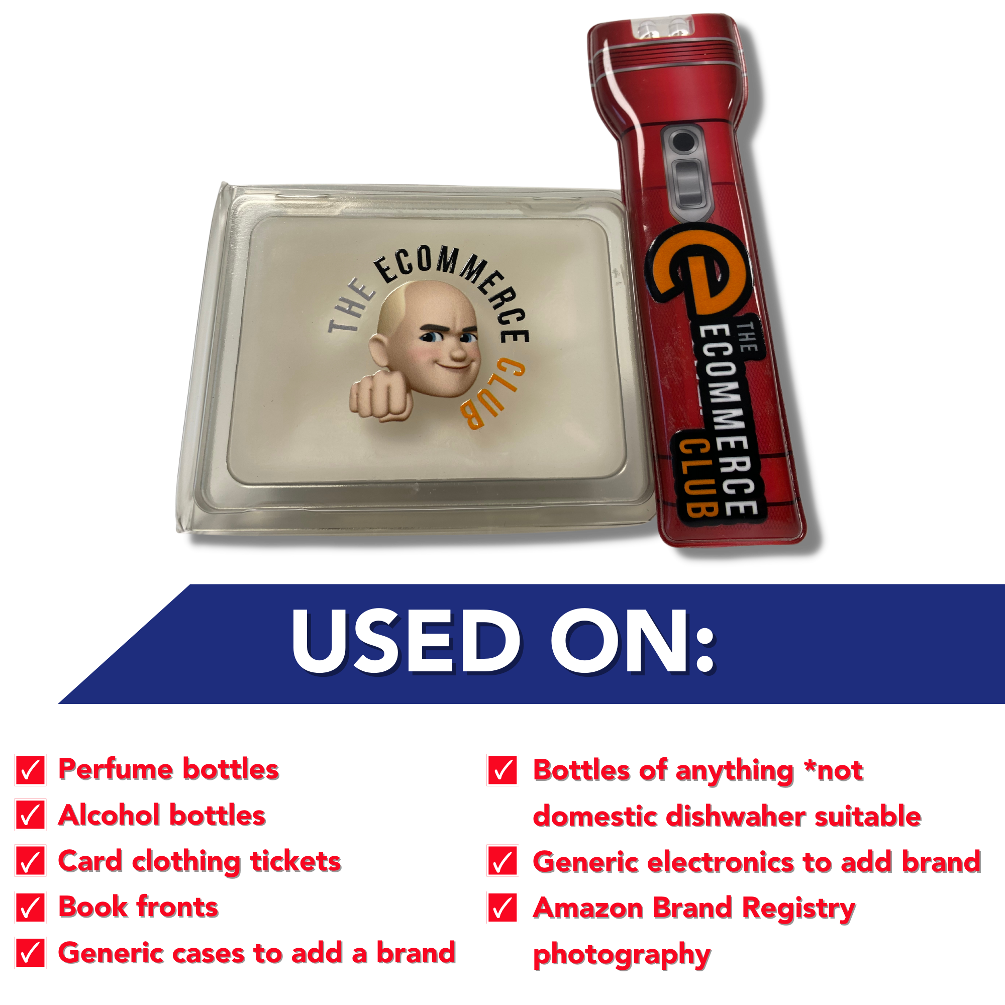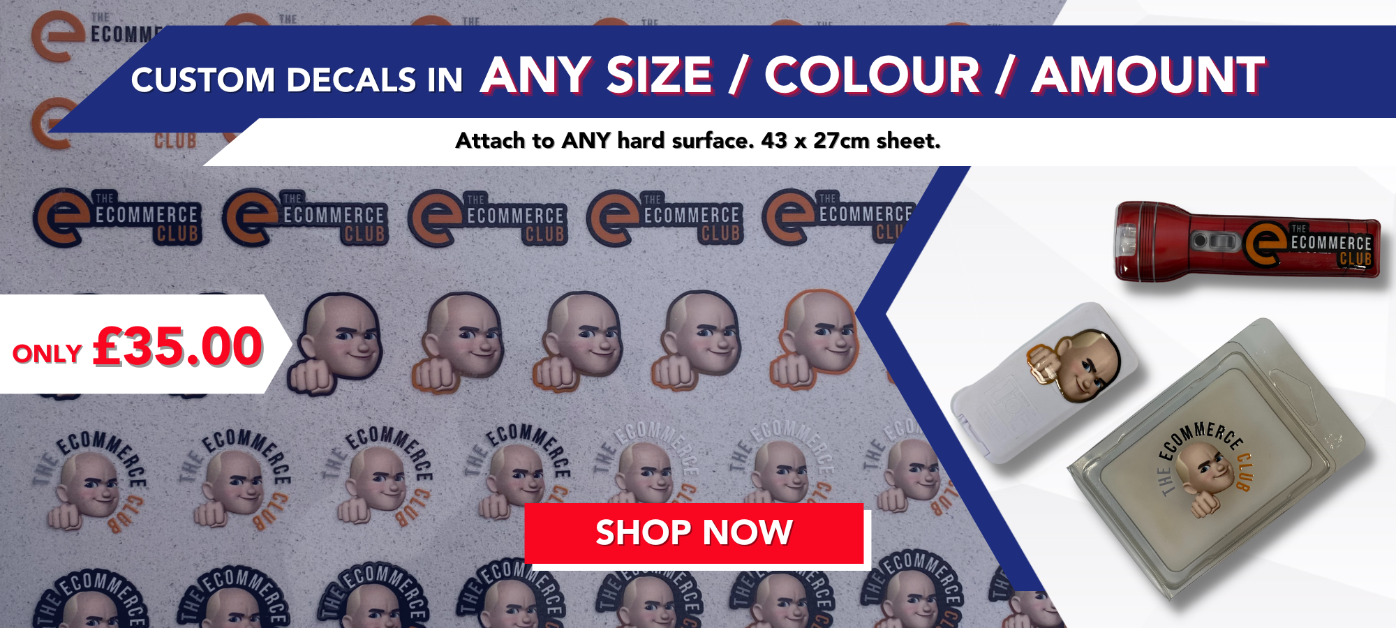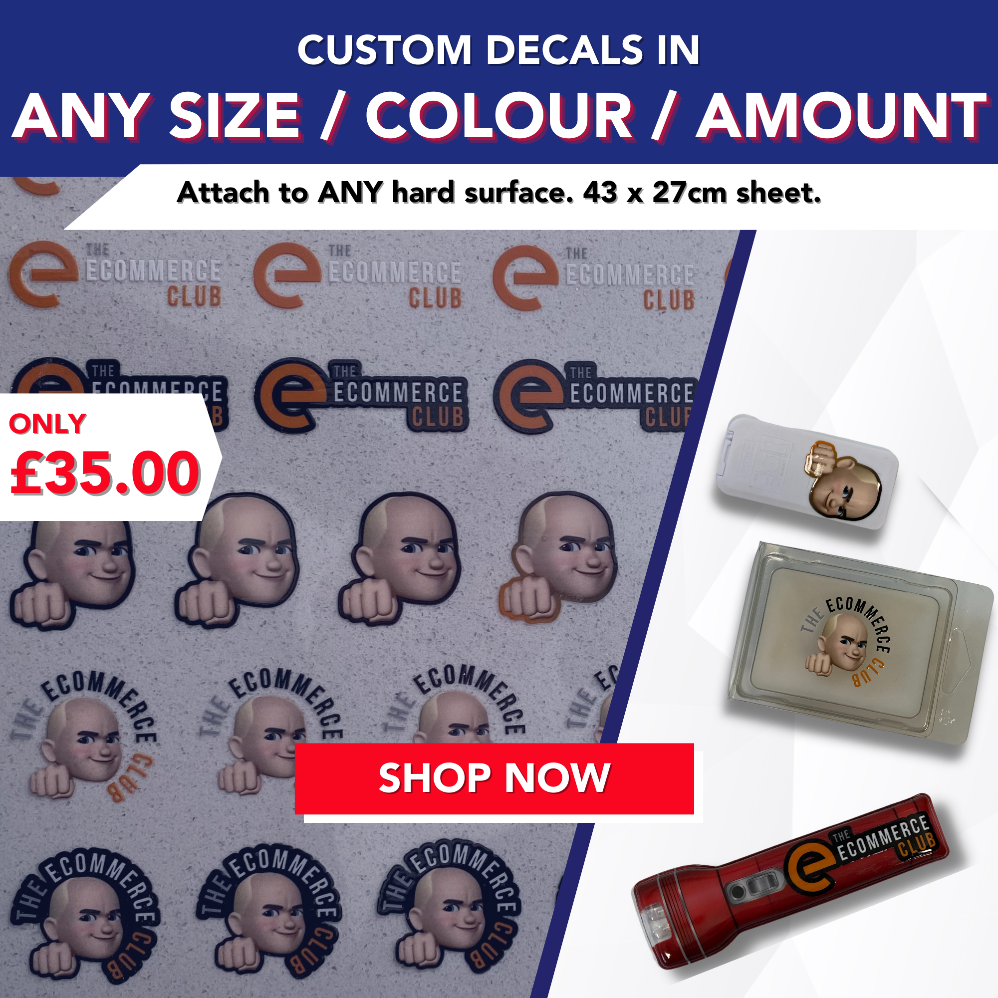 100% customised - ANY SIZE / COLOUR / DESIGN / AMOUNT to fit a 43 x 27cm sheet. This is Direct To Film UV printing, with decals printed on to an adhesive sheet, to then be laminated to a second sheet which "carries it". Rub down onto a hard surface, pull the carrier sheet away and you’re left with a super neat, classy decal.