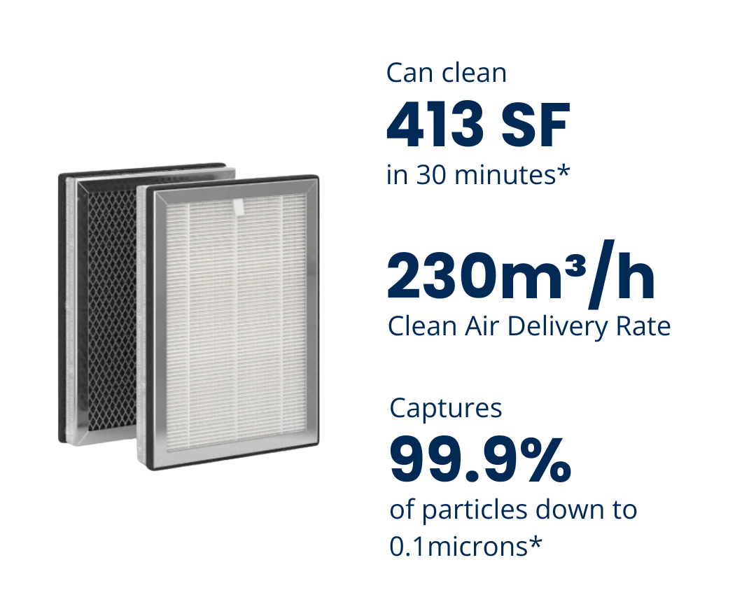 Our HEPA 13 filter removes 99.99% of particles up to 0.1 microns, targeting mould, dust, pollen and pet dander.