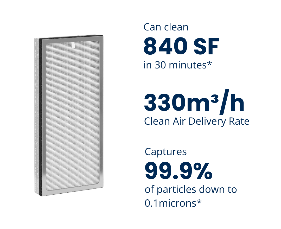 Our HEPA 13 filter removes 99.99% of particles up to 0.1 microns, targeting mould, dust, pollen and pet dander.